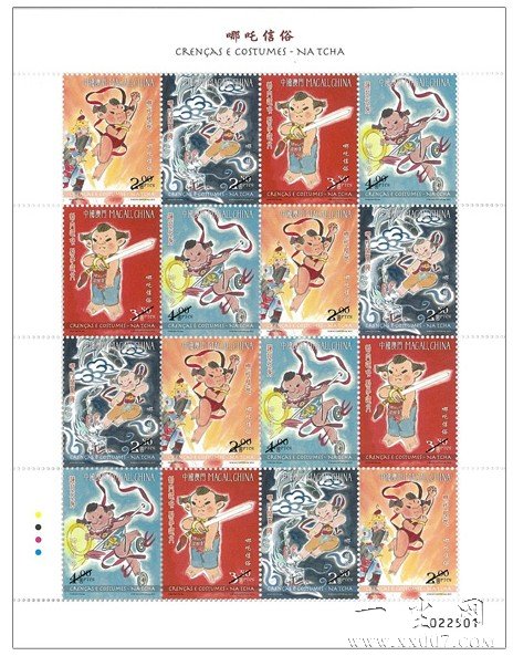 澳门特别行政区邮政局于今日(6月25日)发行《哪吒信俗》邮票1套4枚,图案名称分别为“哪吒降世”、“哪吒闹东海”、“割肉还母,剔骨还父”、“莲花化身”面值分别为澳门币二圆、二圆五角、三圆五角及四圆,邮票规格为30*40毫米。同时推出小型张1枚,小型张面值为十二圆,小型张规格138*90毫米(邮票尺寸30*40毫米)。