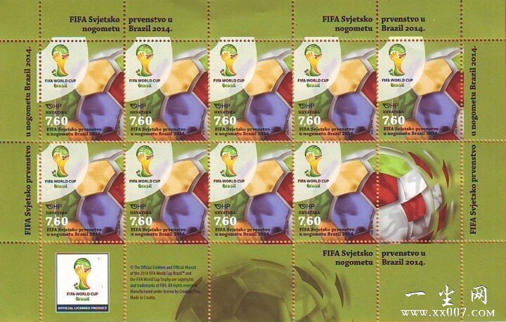 A组之克罗地亚,6月12日发行2014年巴西世界杯邮票。不出所料的传统9+1版式,附票上的红白格使人一眼就能认出是克罗地亚。