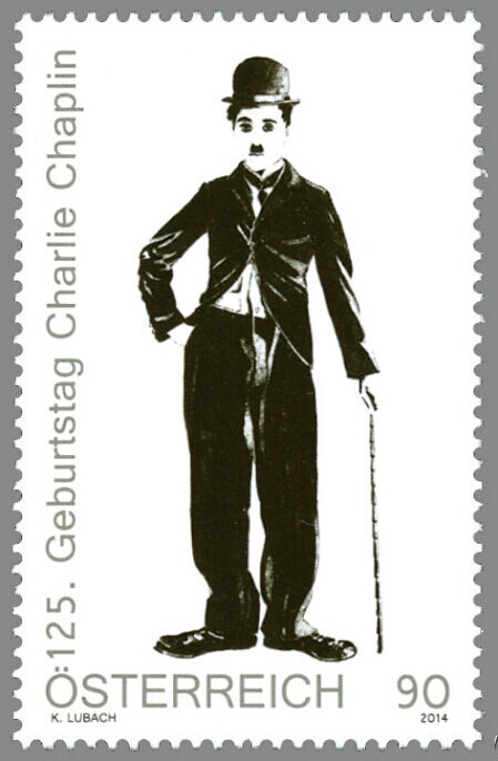 为纪念卓别林诞生125周年奥地利邮政于2014年4月12日发行纪念邮票(上图)。
