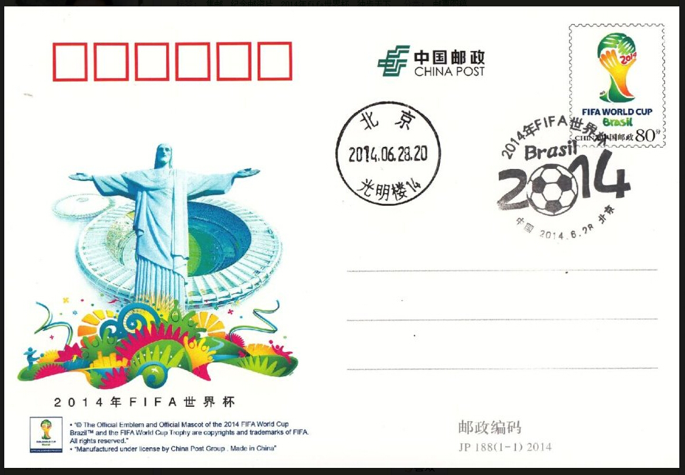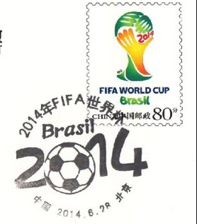 中国邮政于2014年6月28日发行《2014年FIFA世界杯》纪念邮资明信片1套1枚,面值80分,邮资图为2014年巴西世界杯标志。