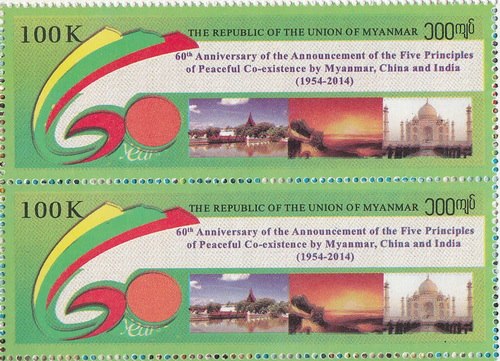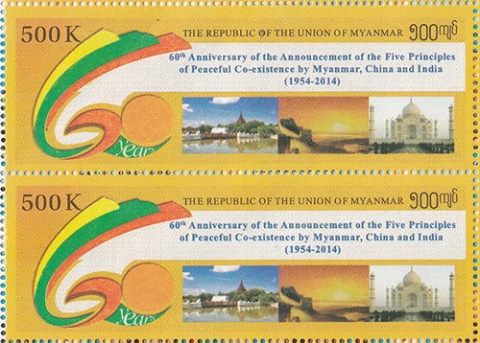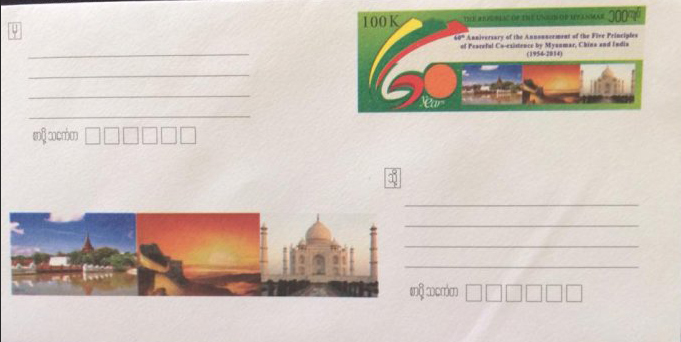 近日,缅甸邮政发行和平共处五项原则邮票一套2枚,邮票图案相同,颜色与面值不同,邮票画面分别缅甸风光曼德勒,中国的长城和印度的泰姬陵。面值分别为100缅币、500缅币。为配合邮票的发行,缅甸邮政还特别制作了首日封。