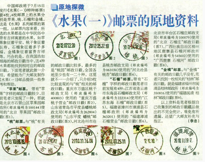 中国邮政定于7月15日发行《水果(一)》特种邮票一套4枚,全套面值5.40元,邮票规格33毫米×33毫米,每版20枚,整版规格200毫米×170 毫米。同时有版式二,整版2套,每版售价10.80元,规格190毫米×110毫米。设计者李志宏,由河南省邮电印刷厂胶版印制。邮票内容是苹果、桃、石榴和金橘。