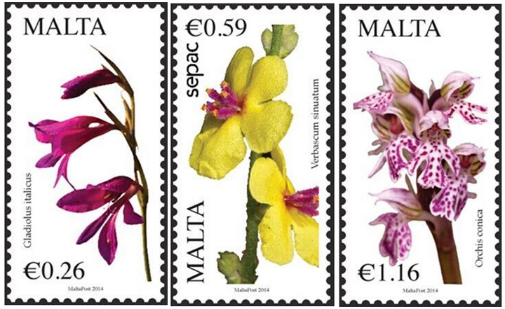 6月底,马耳他邮政发行马耳他花卉邮票一套3枚。邮票图案为唐菖蒲(0.26欧元)、锥形兰花(0.59欧元)、地中海毛蕊花(1.16欧元)。邮票由MaltaPost P.L.C.设计,原照片由埃德温兰弗兰科提供。邮票规格为20mm*38mm,每版包含10枚邮票。