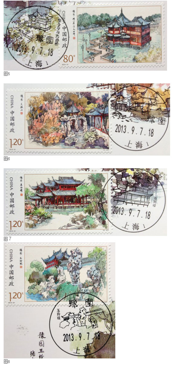 任何风景都不会孤立存在,所谓风景,实质上是在一定的条件之中,以山水景物,以及某些自然和人文现象所构成的足以引起人们审美与欣赏的景象。同样园林中的景观也有周围环境的配合问题,植物可以使景点充满自然清秀的气息,水体恰到好处的处理可以增加烟波浩渺的氛围,亭台的体量和设置合宜,巧妙地烘托山势,担负起供游人休息、赏景的功效。“豫园湖心亭与九曲桥”(图1),湖心亭与九曲桥互相衬托,留白自然成为一泓池水,整个戳图让人回味无穷。“豫园大假山”(图2),大假山后陪衬着亭廊,彰显了园林的格局,让人领略了中国园林的风采。“豫园玉玲珑”(图4),同样没有孤立地展示这块太湖石,石后衬以玉华堂和园墙,成为一个完整的景致,令人流连忘返。然而“豫园卷雨楼”(图3),戳中的卷雨楼成了“孤家寡人”,与同名邮票相比较,缺少了池水树木的烘托,卷雨楼就失去了烟雾迷蒙的氛围,山光隐约的绝景。由于风景图案仅有约直径30毫米圆一半的弹丸之地,因此设计者容易舍掉陪衬的风景,来突出主景。这样戳中的图案就缺少了风景元素,风景图案就成了模型。