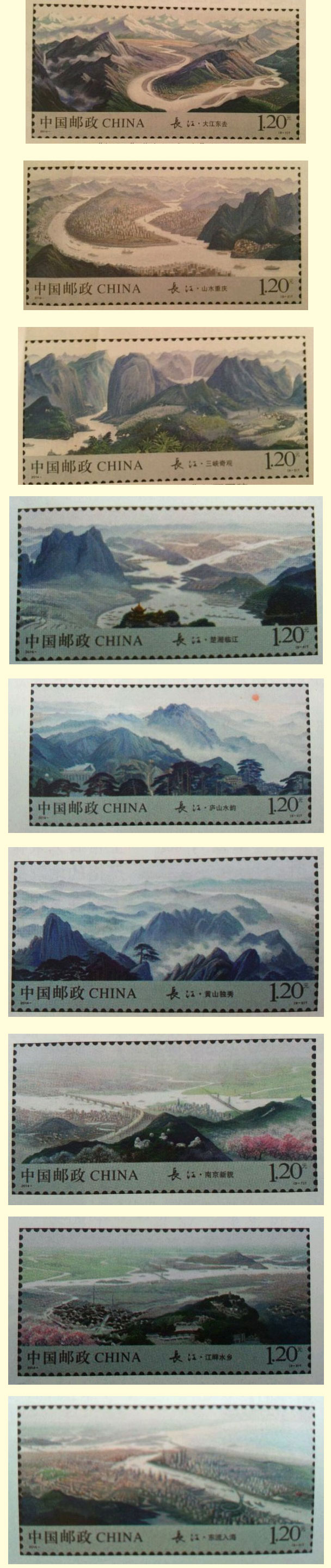 中国邮政定于2014年9月13日发行《长江》特种邮票一套9枚,内容分别为:大江东去、山水重庆、三峡奇观、楚湘临江、庐山水韵、黄山独秀、金陵春晓、江畔水乡、东流入海,全套面值为13.20元。每版规格为220*120cm,整版面值为13.20元。上图为网友上传的关于《长江》特种邮票图稿。
