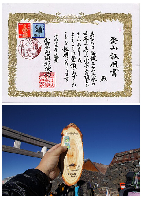 众多登山游客会在富士山顶邮局开放后,在里面购买明信片和登山证明书,为回忆增加一份纪念。