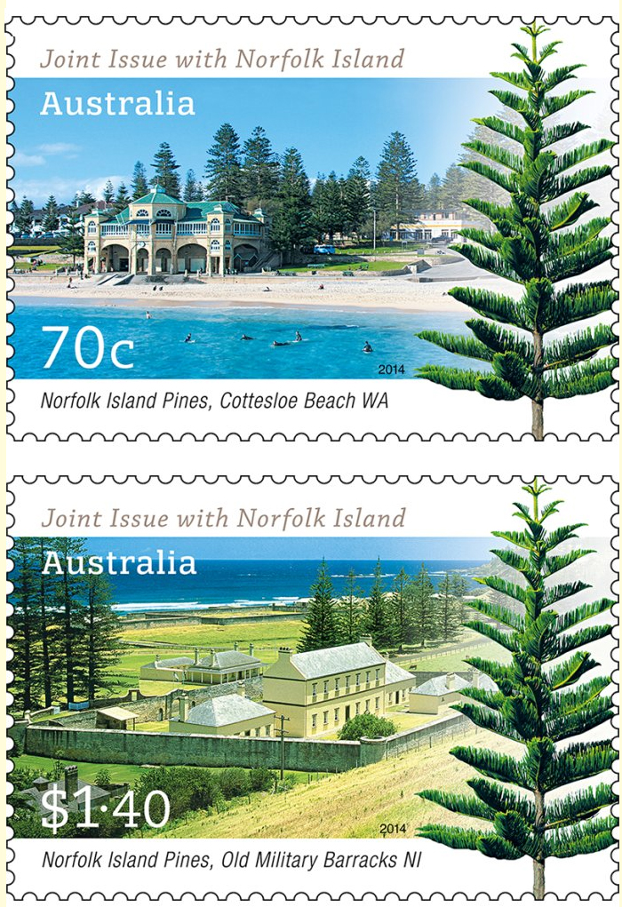 7月22日,澳大利亚与诺福克岛联合发行邮票,这一联合发行邮票的主题是诺福克岛松,学名异叶南洋杉,是诺福克岛的符号。诺福克岛松也在澳大利亚广泛种植,特别是在沿海地区,作为观赏树。1.40美元的邮票设计显示了诺福克岛金斯敦的旧军营,建于1832年,现在是岛上的立法大会所在地。