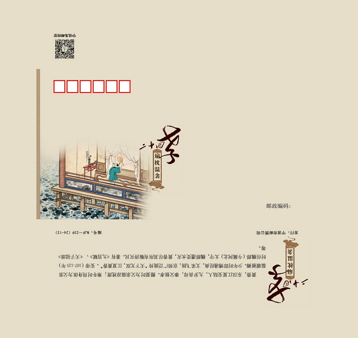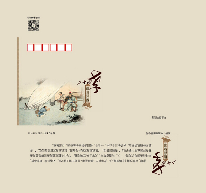 宁波市邮票公司定于2014年7月26日发行《二十四孝》纪念封三枚,分别为24-13(扇枕温衾)、24-14(拾葚异器)、24-15(涌泉跃鲤)。首发当天我们还将启动《南塘老街》风景戳一枚