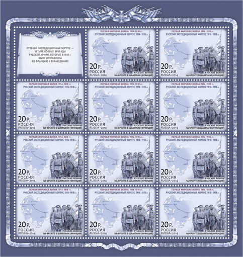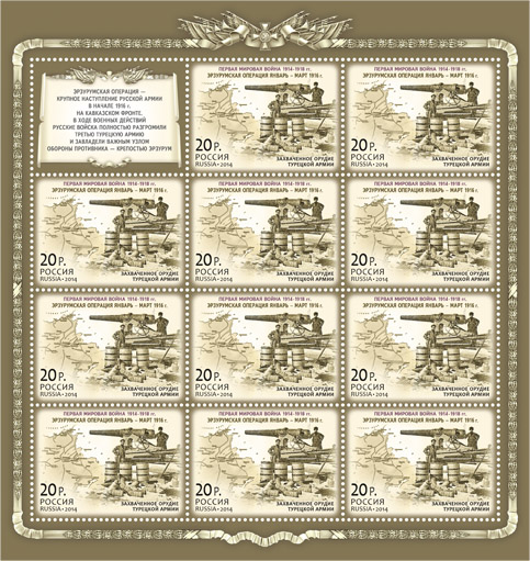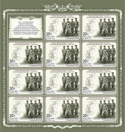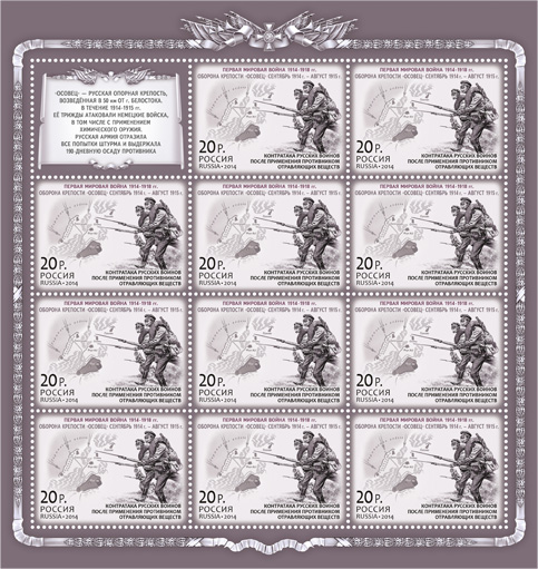 本月31日,俄罗斯邮政增加发行第一次世界大战100周年邮票一套。邮票一套4枚。图案分别为1914年-1915年的Osovets要塞保卫战、1916年Brusilovsky突破战、俄国远征军、埃尔祖鲁姆战役。邮票面值均为20卢布。整版包含11枚邮票及一枚附票。A. Moscovets设计。邮票发行量为33000版。