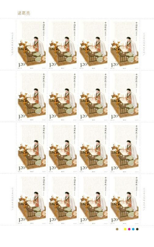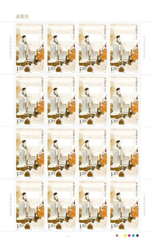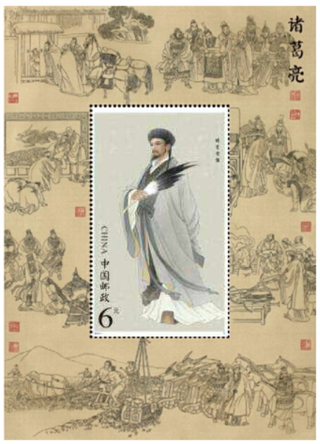中国邮政定于2014年8月28日发行《诸葛亮》特种邮票一套2枚,小型张1枚,全套面值为8.40元。该套邮票发行版式二,4套8枚。整版面值为9.60元,邮票大版整版16枚。邮票图名分别为卧龙出山和鞠躬尽瘁,第一枚描述的是刘备三顾茅庐,与诸葛亮分析天下形势,后人称此场景为“草庐对”或“隆中对”。 第二枚描述晚年诸葛亮创作《出师表》的场景。小型张是诸葛亮半侧面立像,背景搭配三顾茅庐、草船借箭、平定南中、诸葛连弩、木牛流马、屯田垦殖、泪斩马谡、白帝托孤等八个诸葛亮的典型故事和主要功绩。