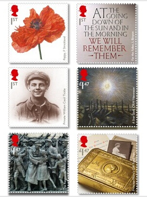 该系列的首套邮票共6枚于7月28日发行(见图),图案分别为:作为缅怀战争逝者象征的红罂粟花,今年英国皇家邮政邀请了英国著名的植物题材画家、英国植物画家协会成员菲奥娜·斯特里克兰(Fiona Strickland)对这一传统题材进行了新的诠释;诗人劳伦斯·比尼恩(Lawrence Binyon)的诗作《献给阵亡者》(For the Fallen)中的部分诗句,该诗歌发表于1914年9月21日的《泰晤士报》;列兵威廉·狄克尔(William Tickle)的照片,他于1914年9月被征召入伍,当时仅有15岁,于1916年在索姆河战役中阵亡;内文森(CRW Nevinson)的画作《照明弹》,内文森被认为是描绘“一战”题材最重要的画家之一;威尔士艺术家威廉·戈斯坎比·约翰(Sir William Goscombe John)的青铜雕塑《响应》,反映民众响应征召加入军队的情景;最后一枚邮票表现的是“玛丽公主礼盒”。1914年10月,英王乔治五世的女儿玛丽公主发起圣诞礼物献金活动,主要目的是为在海外作战的英军士兵每人提供一份圣诞礼物,该运动的最终成果就是被称为“玛丽公主礼盒”的黄铜质盒子,内装一张圣诞贺卡、玛丽公主的照片以及给军人的圣诞礼物。