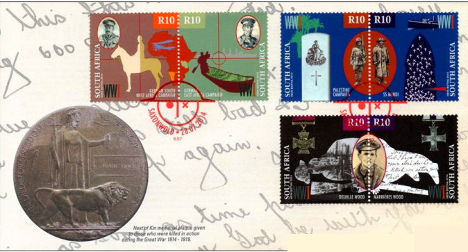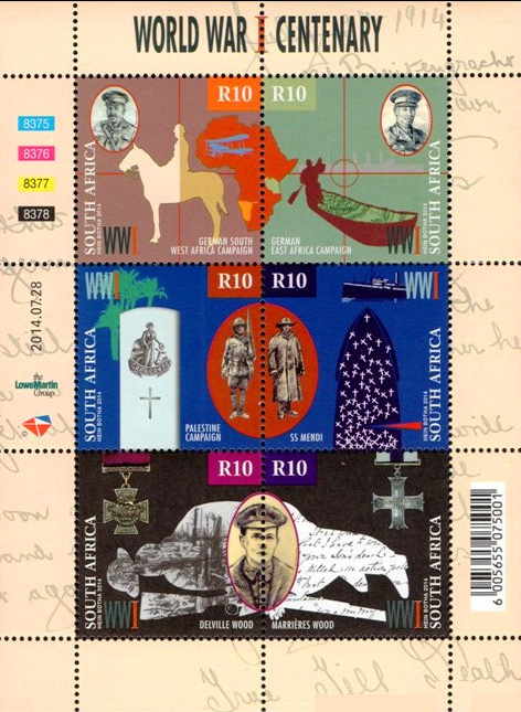 7月28日,南非邮政发行第一次世界大战百年邮票一套6枚,小版形式印刷。邮票主图由非洲地图、人物、武器、勋章等组成。每枚邮票面值均为10兰特。为配合邮票的发行,南非邮政同日还发行首日封一枚。