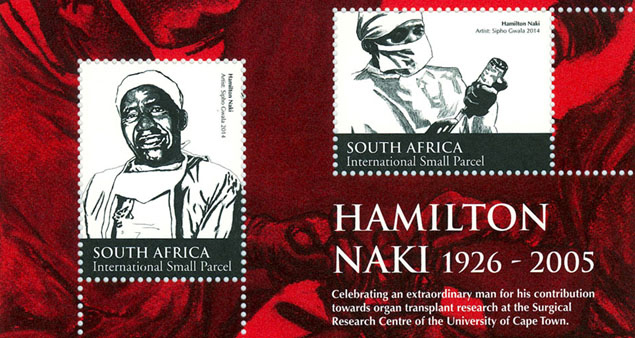 日前,南非邮政发行小全张一枚,纪念南非著名黑人医生汉密尔顿.纳基。邮票主图为汉密尔顿.纳基。邮票由G.西波设计,路易斯.文尼克撰写文字。法国Cartor印刷公司印制,发行量10万枚。