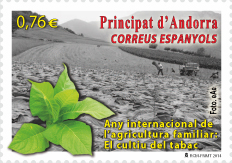 西属安道尔邮政在今年8月没有邮票发行计划,继7月发行邮票之后将于9月15日发行新邮一套一枚,名称为国际家庭农业年。邮票主图为烟草种植。面值0.76欧元。胶版印刷。邮票规格41mm*29mm。整版包含25枚邮票,邮票发行量为9万枚。为配合该套邮票的发行,西属安道尔邮政还制作了邮品,也将在同日发行。