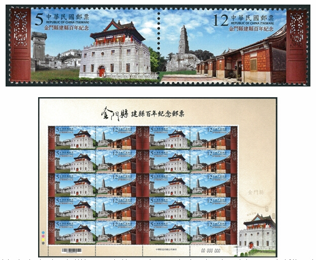 邮票采横联刷设计,以清金门镇总兵署建物的窗(樘)板分置两侧,寓意进访金门的岁月风华。主图分别为莒光楼结合水头聚落洋楼群(面值5元)、山后民俗文化村传统闽南建筑搭配国定古迹文台宝塔(面值12元),以彰显金门丰富的人文史迹及诠释金门雄固海疆的特殊定位。相关图片由金门县政府提供。