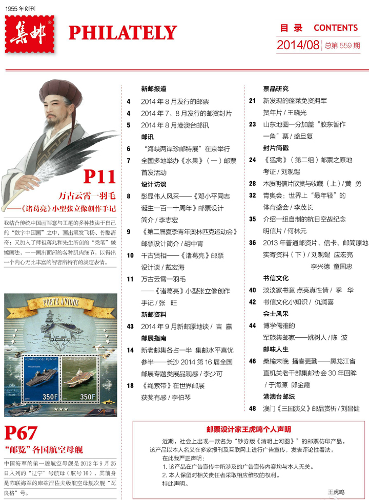 《集邮》杂志 《集邮》杂志2014年第8期现已上市,精彩内容有:万古云霄一羽毛——《诸葛亮》小型张立像创作手记、新老邮集各占一半 集邮水平喜忧参半——长沙2014第16届全国邮展专题类展品观感、回首第一届夏季青年奥运会邮票、飘香的咖啡——品味“巴黎画派”、部分邮票近期市场价格等,具体内容请参看本期目录。