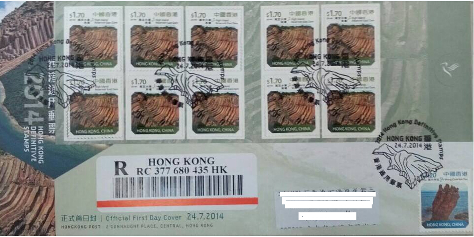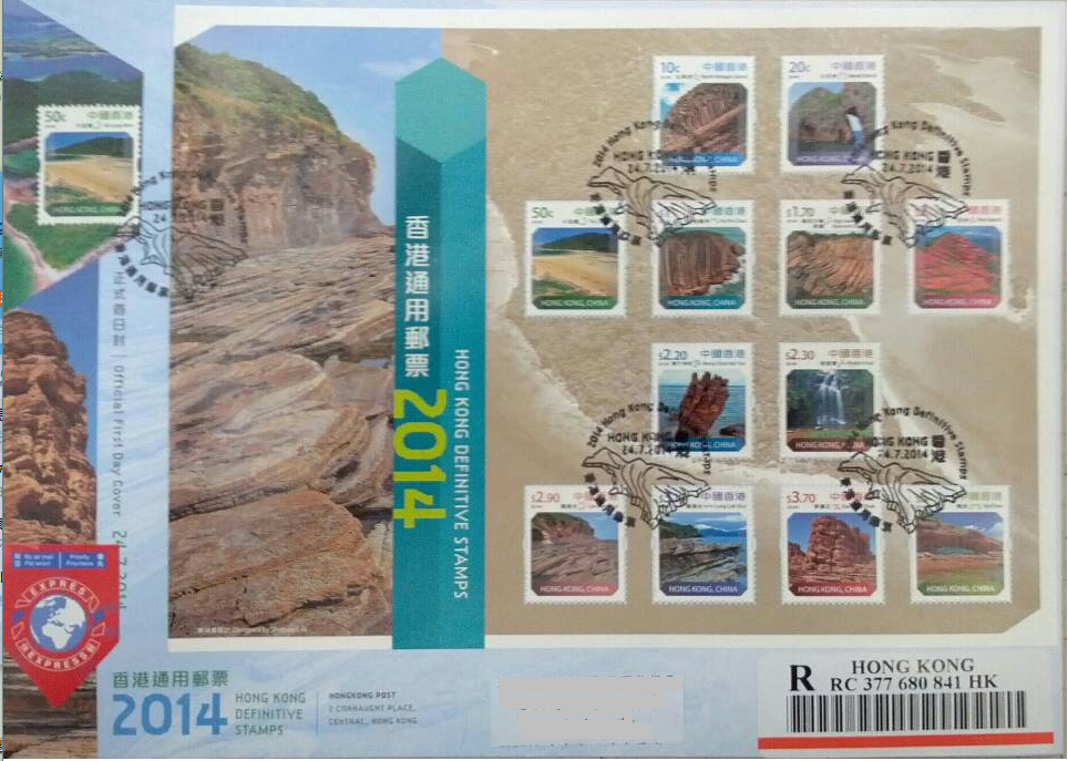 香港地质公园通用邮票实寄封 香港邮政即将于2014年7月24日发行以中国香港世界地质公园为设计主题《2014年香港通用邮票》,全套邮票16枚,新一套通用邮票以中国香港世界地质公园园区的景观为题,于小小的邮票内展现香港独特的风景地貌。邮票展现的景点包括万宜水库东坝、北果洲、火石洲、大浪湾、破边洲、赤洲、黄竹角咀、新娘潭、难过水、龙落水、更楼石、鸭洲、桥咀洲、粮船湾、荔枝庄、白沙头咀。