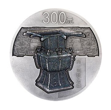 1公斤圆形银质纪念币背面图案为商代亚址方尊,衬以该器物兽面纹样等装饰组合设计,并刊“商·亚址方尊”字样及面额。