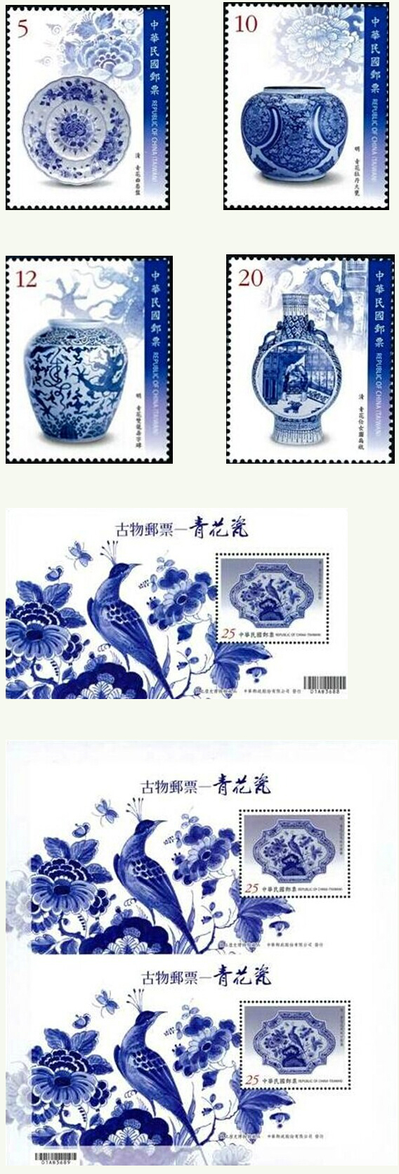 為闡揚中國歷代文物之美,台灣郵政以“國立歷史博物館”典藏的青花瓷器為題材于9月19日發行郵票,全套四枚,另有小型张一枚。四枚邮票为清 青花曲唇盤、明 青花牡丹大甕、明 青花雙龍壽字罈、清 青花仕女圖扁瓶、小型张圖案:清 青花花鳥紋方圓盤。