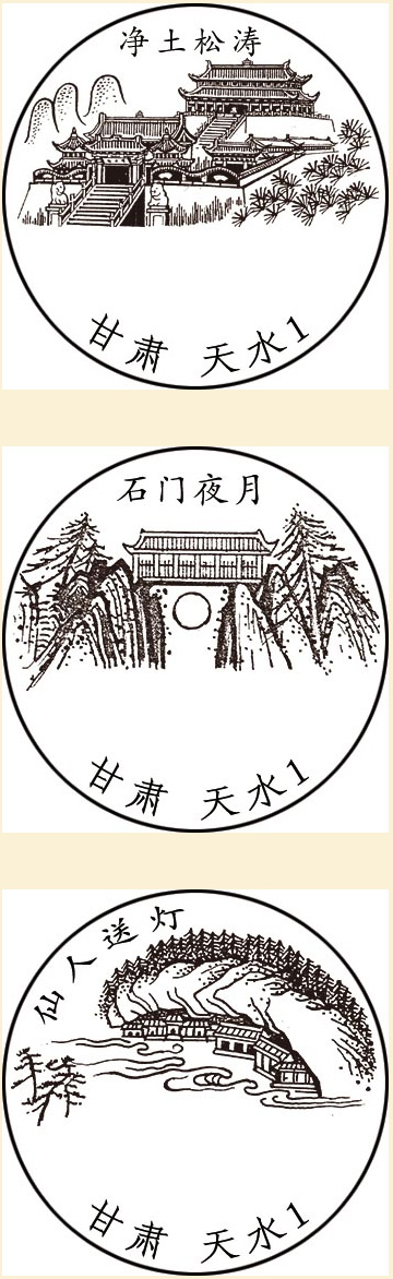 麦积山石窟是我国著名的四大石窟之一,麦积山风景区地处秦岭山脉西端,北跨渭水,南携嘉陵,山拥岚光,峰峻奇秀,山水林泉,美不胜收。山奇,水秀,林茂,云飞的麦积山、仙人崖、石门山和净土寺景观成为国家重点风景名胜旅游景区,是国务院第一批公布的44个国家级风景名胜之一。天水市邮政局、天水市邮公司、天水市集邮协会,于"麦积山"主题邮局成立开业之日,申报刻制了"仙人送灯"、"石门夜月"、"净土松涛"风景日戳一套三枚,戳径:30mm,于2014 年8月28日启用,日戳可更换日期字钉。同时还启用了"十二生肖纪念图章"一套十二枚,为中外游客和集邮爱好者服务。