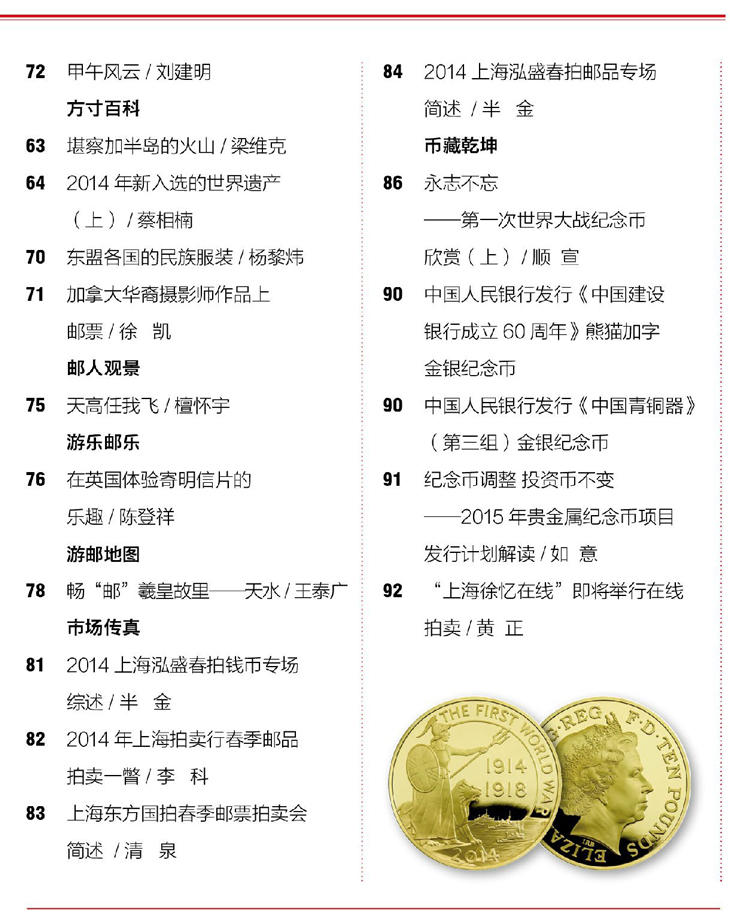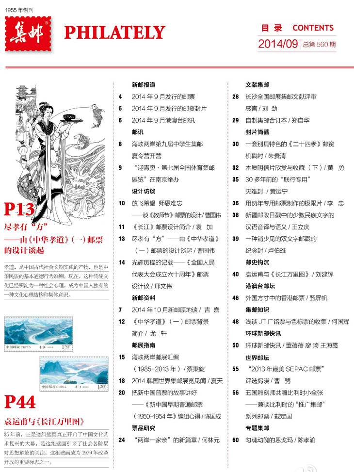 《集邮》2014年第9期上市了!精彩内容有:2014韩国世界集邮展览见闻、袁运甫与《长江万里图》、2014年新入选的世界遗产(上)、永志不忘——第一次世界大战纪念币欣赏(上)等,详见目录。