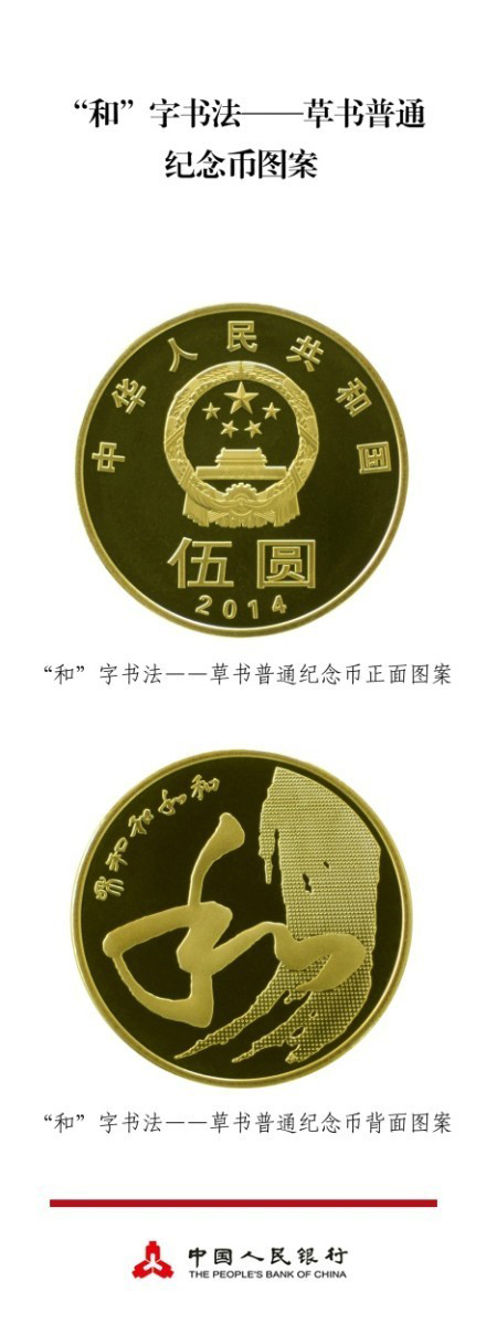 该普通纪念币正面主景图案为中华人民共和国国徽,内缘上方刊国名“中华人民共和国”,下方刊面额“伍圆”及年号“2014”;背面主景图案为草书的“和”字,衬景图案为书法的飞白,内缘左上方刊“和”字的5种书法体。
