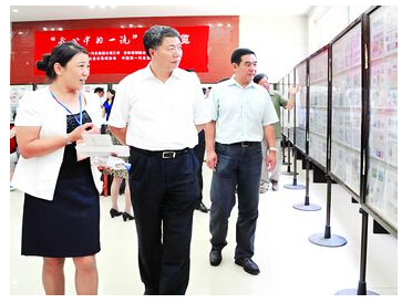 图为长春市集邮协会负责同志在邮展现场向一汽集团相关领导介绍集邮展品。