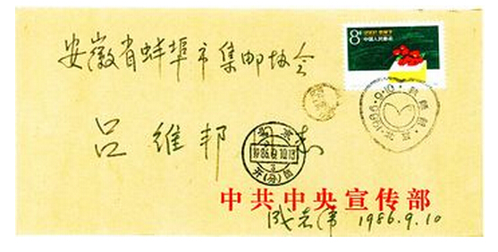 在邮票发行当日,笔者的邮友、中宣部艺术局的成志伟先生以中宣部公函封实寄来一枚首日封。封右上角所贴邮票上盖着一枚黑色心形的“教师节”专用纪念戳,封的中部盖着一枚北京1986年9月10日教师节当日的收寄日戳。整个首日封书写规范、戳印清晰,品相极佳,是一枚记载教师节邮票“首发的自然封”(见图)。