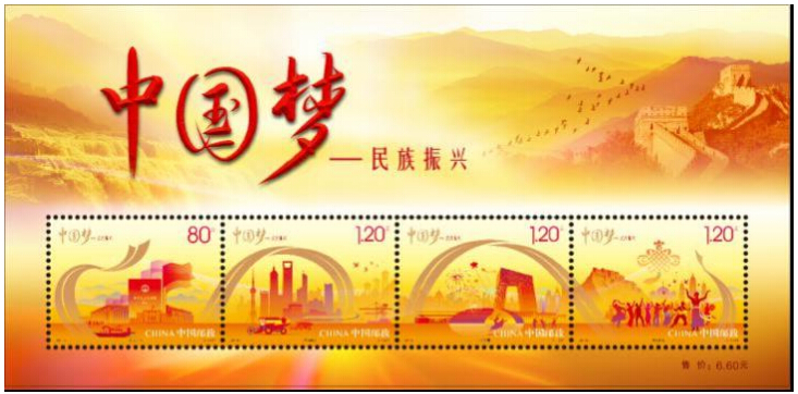 中国邮政定于2014年9月20日发行《中国梦-民族振兴》特种邮票1套4枚,小全张1枚。邮票图名分别为政治文明、经济发展、文化繁荣、民族团结,全套邮票面值4.40元,小全张售价6.60元。邮票设计者为何洁、周岳、陈楠,邮票为影写版由北京邮票厂印制。