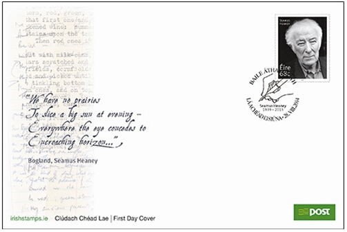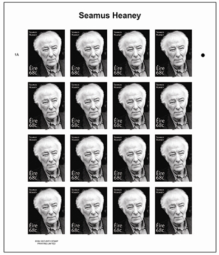 爱尔兰邮政于8月28日发行诺贝尔文学奖得主希尼邮票一套一枚,面值0.68欧元。整版包含16枚邮票,由Vermilion Design设计,爱尔兰安全邮票印刷有限公司印刷。为配合邮票发行,爱尔兰邮政于当日启用纪念邮戳一枚,图案为拿着笔的手,并制作了首日封等邮品。