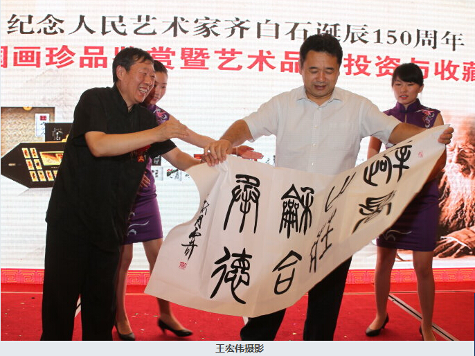 2014年是国画巨匠齐白石先生诞生150周年,为了纪念齐白石一生的不朽成就,此次集藏文化节上展出了两幅白石老人的作品真迹,集藏爱好者与嘉宾一起分享齐白石大师的传奇人生和艺术成就。为了向画坛巨匠齐白石先生一生的辉煌成就致敬,在集藏文化节上,由中国邮政监制发行的《中国珍邮——齐白石》纯金珍藏版、纯银珍藏版和小型张纯银珍藏版三款珍品首次亮相,以黄金白银的珍贵材质艺术诠释和完美表现齐白石意趣横生的作品内涵,堪称收藏、馈赠两相宜的财富珍品。在集藏文化节上还举行了齐白石真迹作品揭幕仪式、纪念封签名仪式、现场访谈周士杰先生,白石老人曾孙、齐派领军人物齐昆山先生现场作画赠送嘉宾,著名邮票设计家张石奇先生现场挥毫泼墨,为集藏爱好者题字留念(见图)。