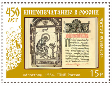 9月3日,俄罗斯邮政发行俄罗斯印刷450周年邮票。邮票一套1枚,面值15卢布,由A. Fedoulov设计。整版包含12枚邮票,发行量30万版。邮票主图为1564年印刷的《使徒》,这是俄罗斯印刷的第一本书籍。为配合邮票的发行,昨天在莫斯科举行了首发仪式,俄罗斯邮政还制作了首日封等邮品。