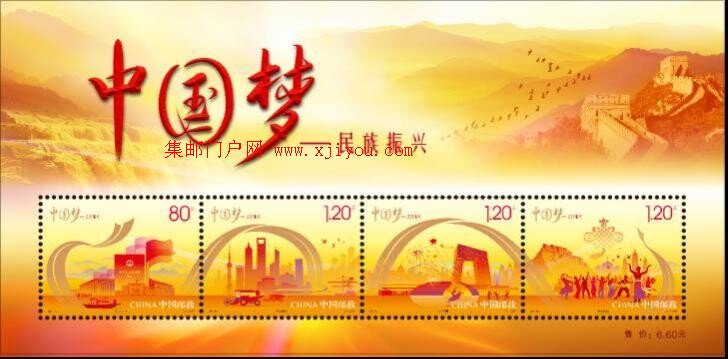 中国邮政定于2014年9月20日发行《中国梦-民族振兴》特种邮票1套4枚,小全张1枚。详情如下: