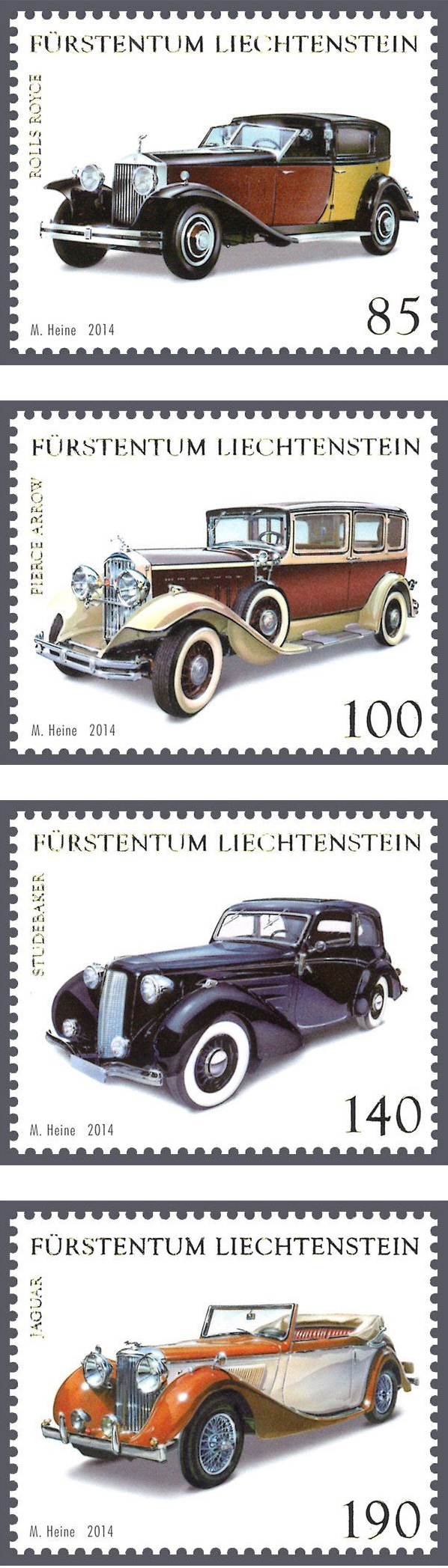 列支敦士登邮政今年继续发行《列支敦士登的收藏》系列邮票一套,其中包含了20世纪20年代、30年代和40年代生产的珍贵轿车。为此,加拿大艺术家马克·海涅用他的油彩精准绘制了这些“稀世珍宝”。金箔烫压印刷则强调了这一汽车主题系列邮票的统一属性。 4枚邮票的图案分别为“劳斯莱斯 幻影II 1933年版”、“皮尔斯·阿罗 133型 1929年版”、“斯蒂庞克 大六 1935年版”和“捷豹 马克IV 1948年版”。