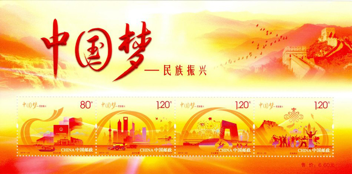 这套邮票由原清华大学美术学院副院长,硕士、博士研究生导师何洁设计。何洁通过关于中国梦的一些讲话内容和会议精神,结合画面内容将邮票整体以腾飞的金丝带贯穿,寓意中华名族的复兴,分别从政治文明、经济发展、文化繁荣、民族团结几个方面阐释,表现国家取得的伟大成就。小全张还配以黄河壶口瀑布以及八达岭长城,进一步映衬出中华民族自强不息的精神。