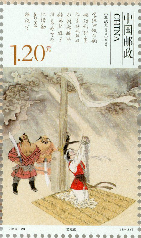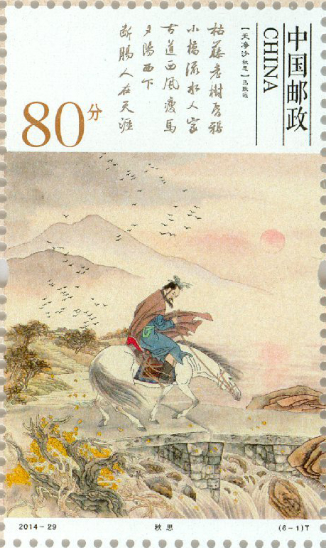 中国邮政定于2014年12月1日发行《元曲》特种邮票一套六枚,拟分别表现元杂剧《窦娥冤》(关汉卿)、元杂剧《赵氏孤儿》(纪君祥)、元杂剧《倩女离魂》(郑光祖)、元杂剧《墙头马上》(白朴)、元散曲《山坡羊•潼关怀古》(张养浩)、元散曲《天净沙•秋思》(马致远)。