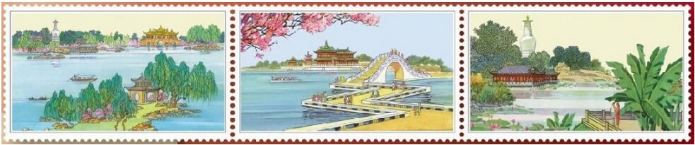 三枚邮票图案分别取景于扬州瘦西湖的钓鱼台、二十四桥和五亭桥,面值分别为1.20元、1.20元和1.50元。三张邮票图案并不是单独的三个景点,而是从不同的角度,来描画瘦西湖的秀丽景色。