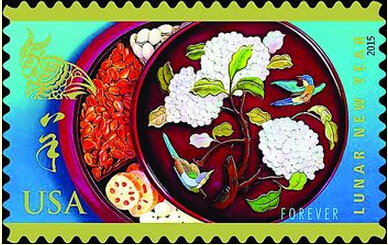 美国羊年邮票图稿于11月4日揭晓。邮票以明亮渐变的蓝色为背景,衬托出一个紫红色的木质糖果果盘。糖果盘盖子上绘有吉祥图案,盘里分格盛放着瓜子、糖藕等小食品。邮票画面高雅美丽,洋溢着热烈的春节气氛(见图)。