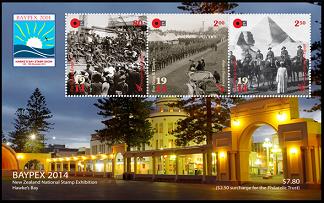 新西兰邮政于邮展开幕日发行纪念小型张1枚,内含邮票3枚,与之前面世的一战百年纪念邮票中的3枚相同,边纸图案为内皮尔市桑德歇尔柱廊夜景,并印有本届邮展的徽志;另每日启用纪念邮戳1枚,限当日在邮展现场加盖。