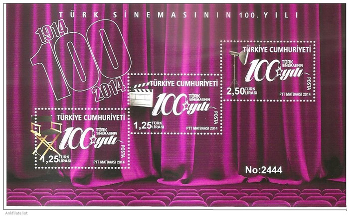 土耳其的电影百年邮票还有一个邮折,里面有枚特别版的限量发行带编号的小型张,设计挺有感觉,邮折的内页设计也很有感觉。随邮折发行的特别版带编号小型张,发行量奇低,电影百年的邮票发行量是10万,邮折也就是编号小型张发行量仅仅3000。