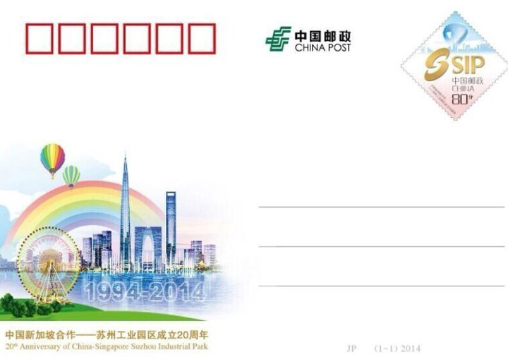 中国邮政发行的《中国新加坡合作——苏州工业园区成立20周年》纪念邮资明信片