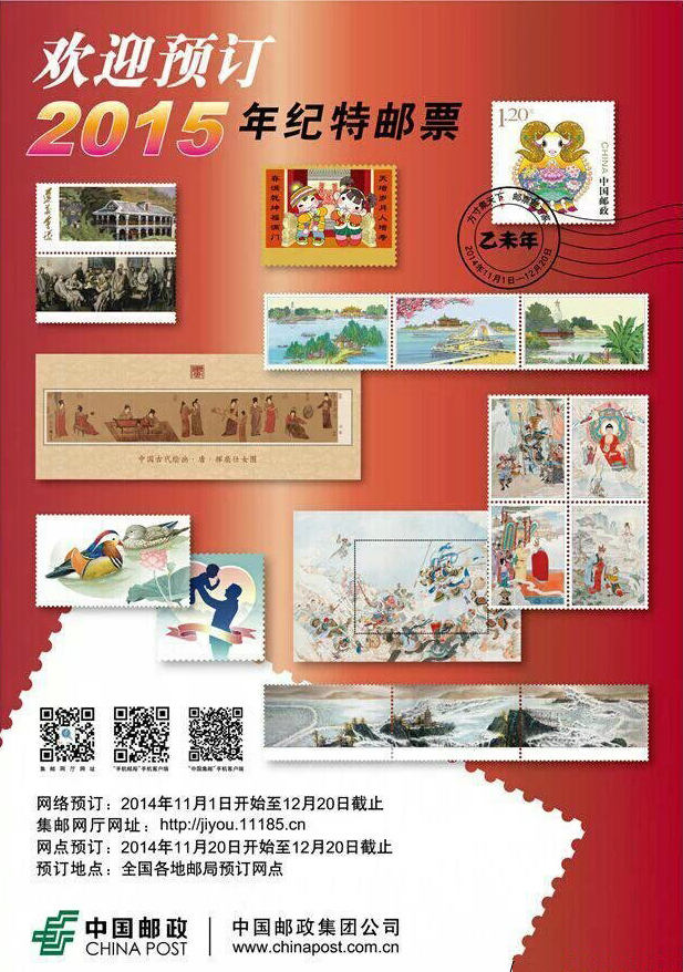 为了宣传2015年的新邮预订,中国邮政推出了《欢迎预订2015年纪特邮票》的宣传海报。海报的底色为渐变喜庆的红色,通过海报我们提前欣赏到了2015年的新邮图稿。海报上总共公布了9套邮票的设计图稿。题材涵括:生肖、民俗贺岁、古典名画、古典名著、旅游景点、自然风光、重大政治事件、家庭生活等方面。