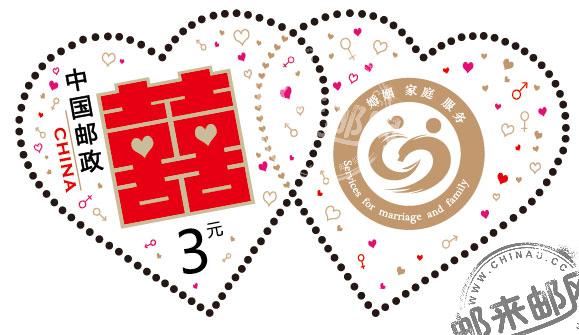 中国邮政定于2014年12月1日发行《婚禧》个性化服务专用邮票1套1枚,面值3元,邮票为心形异形邮票,带有空白附票的个性化服务专用邮票用于邮票个性化服务业务。同时发行附票带有婚姻家庭服务图案的个性化服务专用邮票(整张枚数为8枚,整张规格为190毫米×220毫米)。