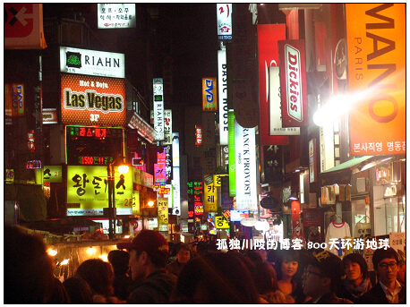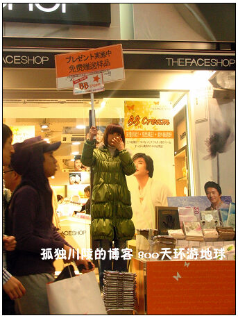 韩国也有着让人惊奇的另一面,和它现代化的形象差别很大,一不小心会被雷倒。例如韩国市中心商店吸引顾客的方式实在有些雷人,我在台北和东京的闹市区都呆过一些日子,还从没见过年轻漂亮的店员小姐大声叫卖的。韩国则不然,不仅敢于叫卖,还冒着严寒站在椅子上举起牌子。 (闹市区韩国女店员以“不雅”的方式招揽生意)在韩国吃一顿饭要多少钱