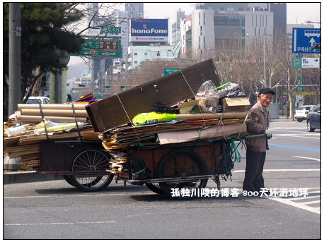 北京在很多年以前就不允许平板车上大街了,然而在韩国市区中心的马路上,大白天还能出现收旧货的人力车,拉着旧货满街跑,这多少有些雷人。图片远端的高楼是韩国市中心的大厦。