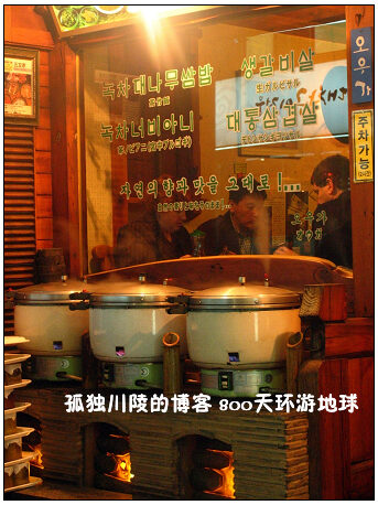 下图中的餐厅把做饭的锅放在店门口,这种方式也挺雷人的。不过,却是一种很有效的经营方式。韩国人很重视吃米饭,这样的布置,既能吸引食客的注意力,告诉他们店内的饭是怎么做的,同时还能节省店内的空间,一举两得。冬季韩国人爱吃路边摊