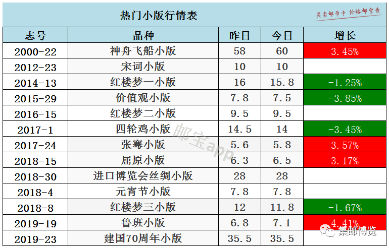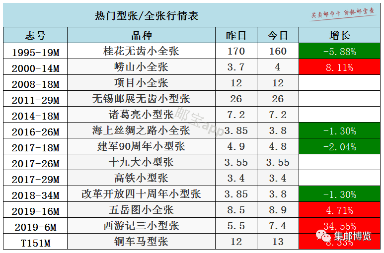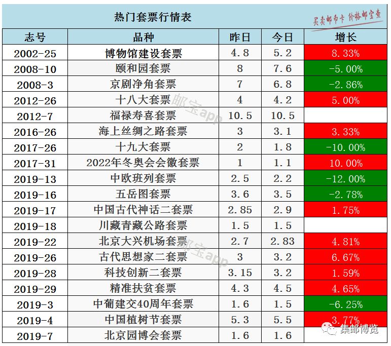 十九大套票昨日最新价格为1.8元,前日价格为2元,下跌10%。